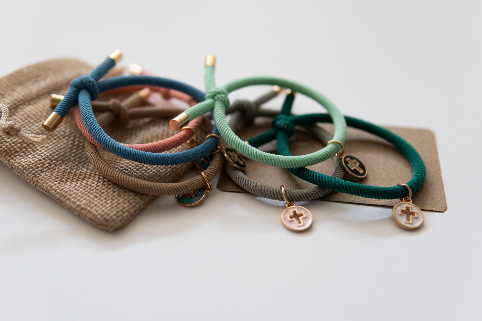 Pulsera de cordón elástico con colgante de cruz esmaltada. Se presenta en saquito de rafia.