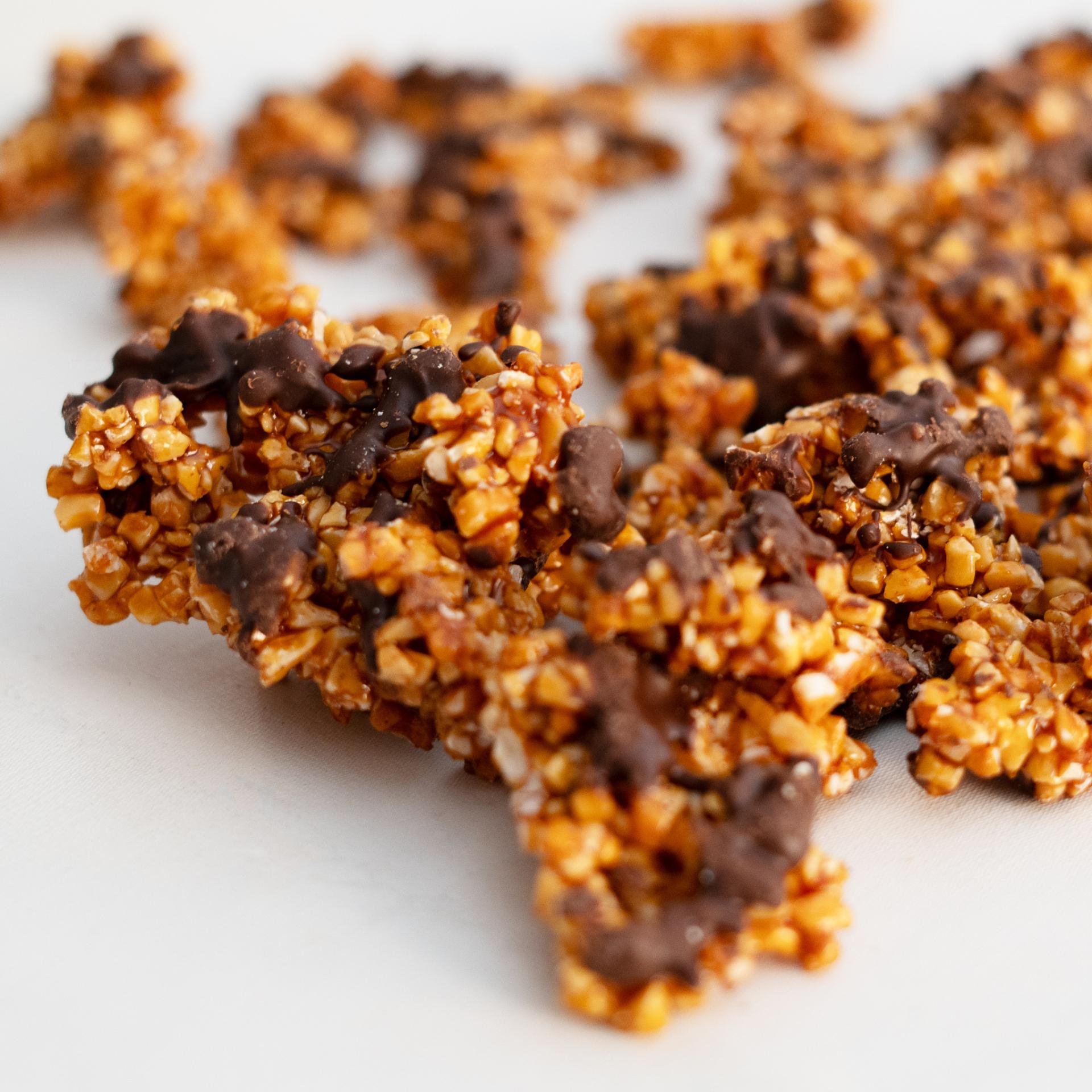 Deliciosos bocaditos crujientes de almendra con caramelo y chocolate, elaborados en el obrador monacal de las monjas Jerónimas del Monasterio de Nuestra Señora de Belén en Toral de los Guzmanes, León.